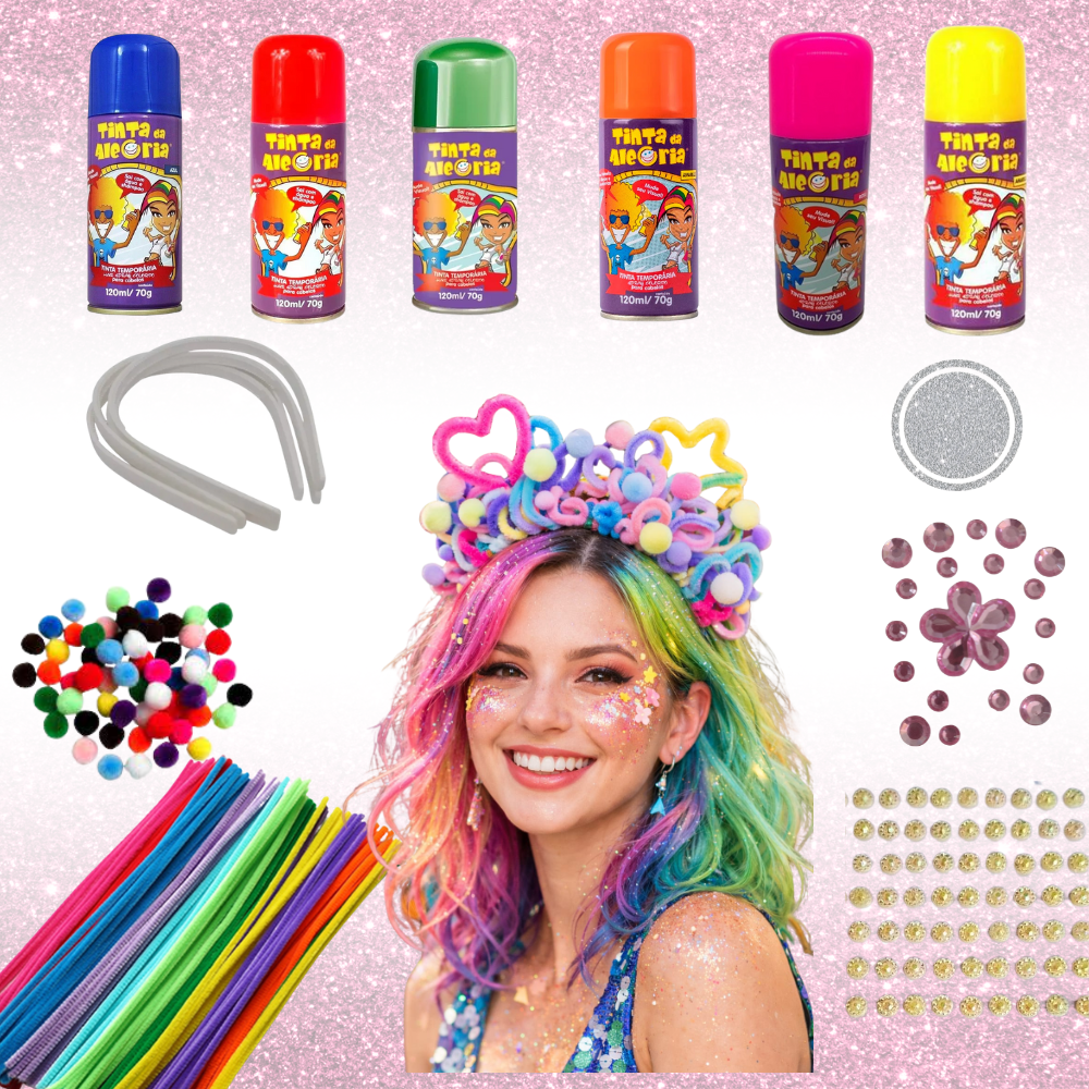 Monte sua própria tiara personalizada, decore o rosto com glitter e miçangas e finalize o look com spray de cabelo colorido. É diversão garantida para adultos e crianças!